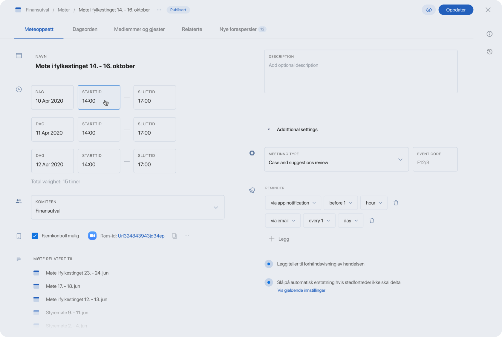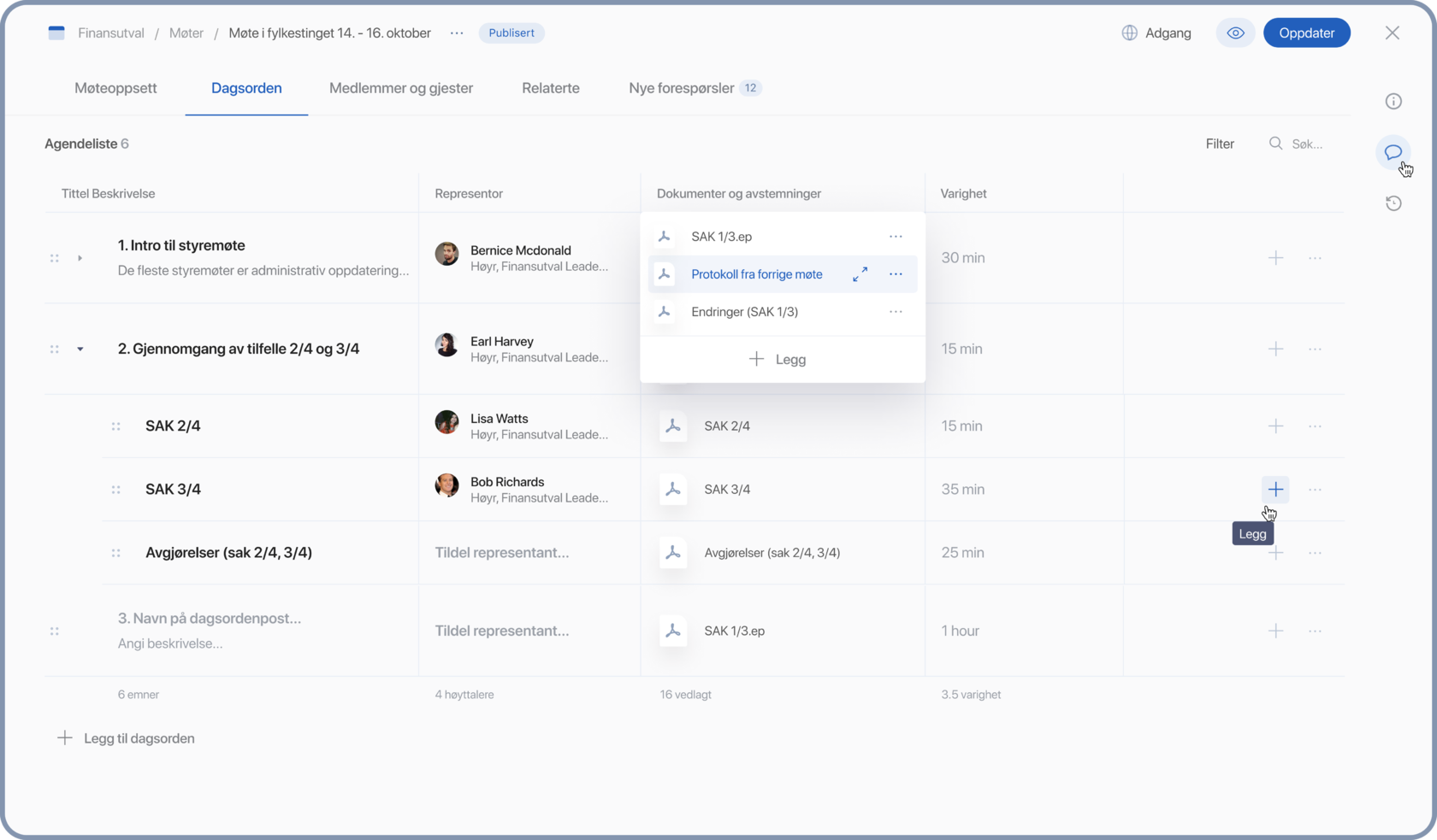 Bruk mindre tid på å forberede dagsorden for omfattende temaer. Bygg på sekunder, med kraftig brukergrensesnitt. Klarlegg, godkjenn saksliste og gi tilbakemelding på saker.